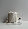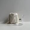 thick glass cup with printed design, packed in a cotton drawstring pouch